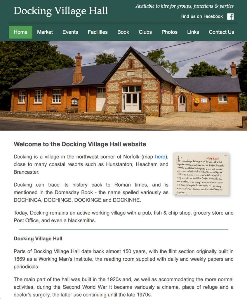 The website for this village community hall was designed from scratch, with the specific objectives of broadening awareness of activities in the hall, promoting the weekly farmers' market held there and increasing bookings for the hall facilities by outside groups.